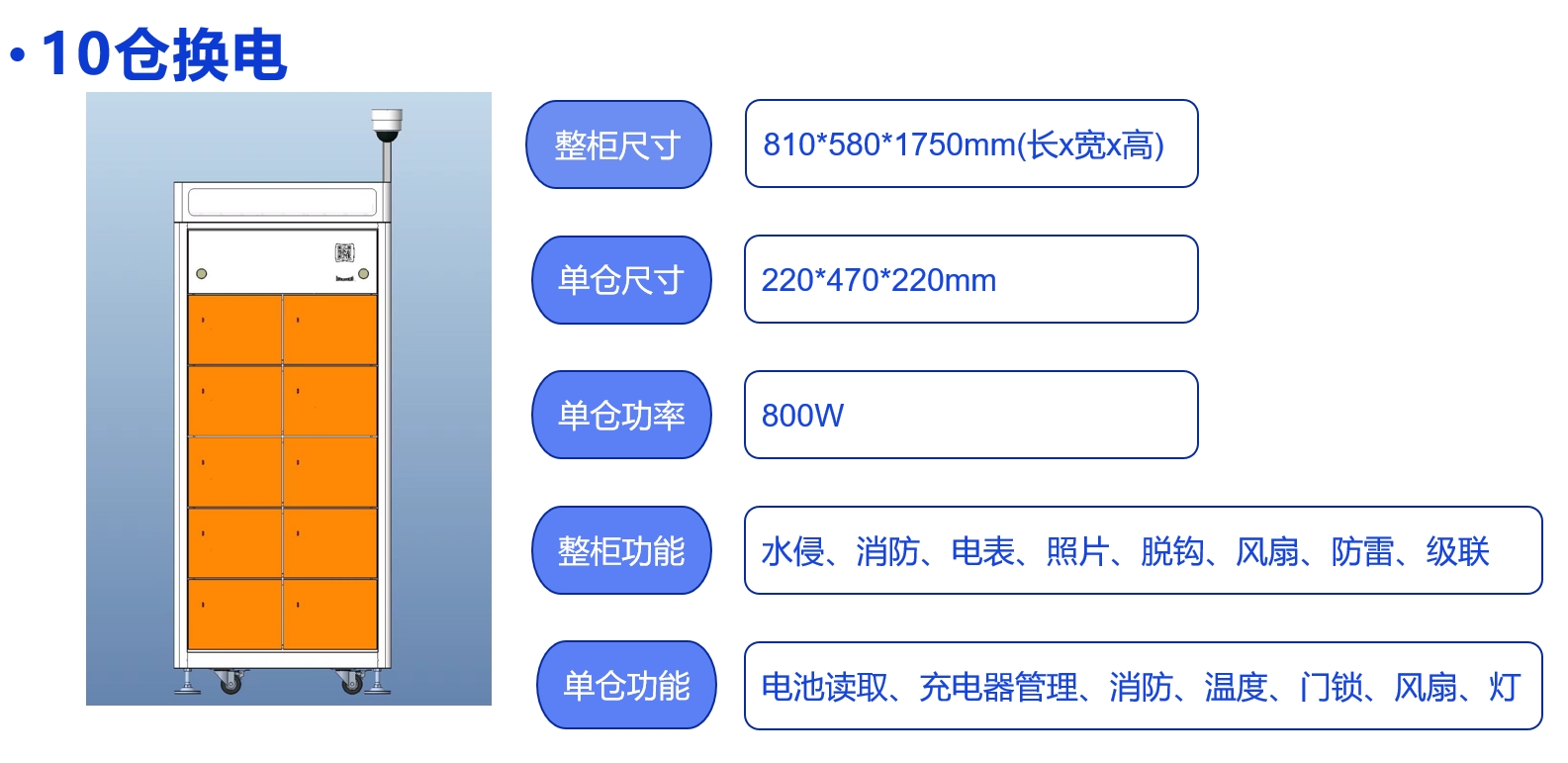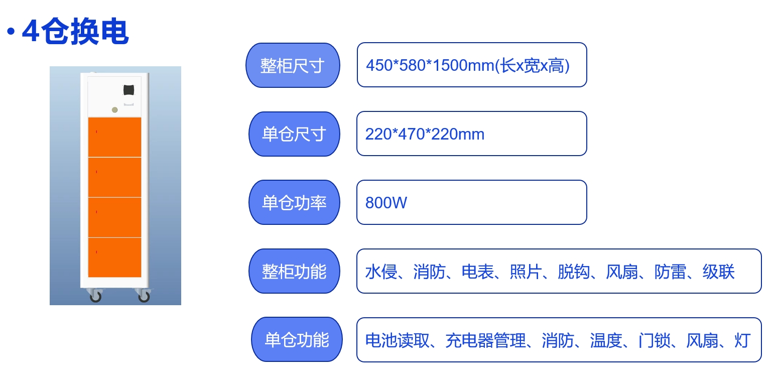 產品特點 速 度 快:換電僅需10秒,無需等待,即刻出發; 操作便捷:小程序掃碼換電,輕松一掃,簡單方便;安全性高:遠離充電不當帶來的安全隱患,有氣溶膠/水消防兩種不同的裝置為換電過程保駕護航; 電池維護:提供統一電池維護及保養服務,無需考慮購買新電池及廢舊電池更換等問題:換電方式:智能換電系統; 充電方式:1000W,750W大功率充電快; 電池保管:GPS+GPRS雙重定位,一切盡在掌握中換電柜適用范圍: 適用類型:兩輪電動車、三輪電動車、電動助力車: 顏色外型:可定制。
