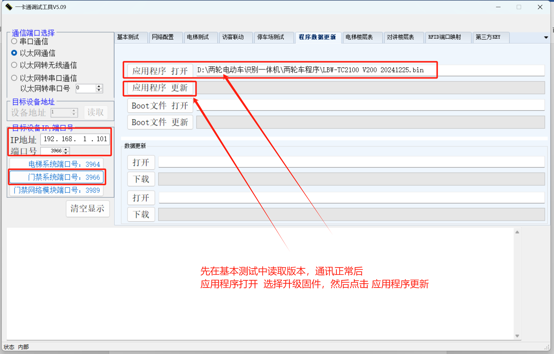 8、兩輪車識(shí)別模塊固件升級(jí)方法,打開一卡通調(diào)試工具,先讀取版本,通行正常后,按如下操作升級(jí)
